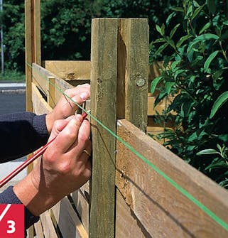 Spenn ut ei snor mellom de ytterste stolpene slik at den flukter med overkanten av det øverste bordet. Merk alle stolpene rett bak snora.