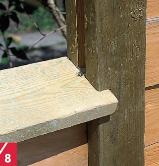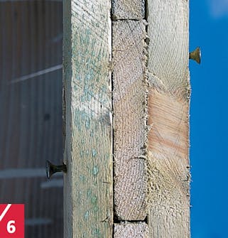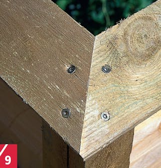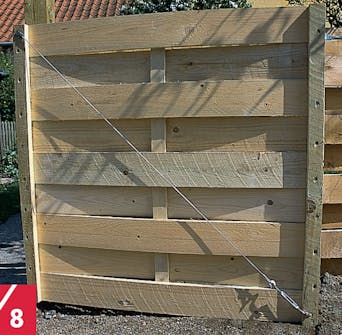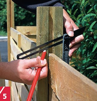 Et bord på toppen av gjerdet rammer seksjonene pent inn, og så hjelper bordet med til å holde orden på stolpene. Stolpene skal sages av skrått i toppen slik at vannet renner av i stedet for ned i treet.