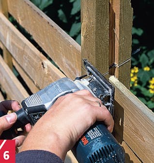 Du kan godt sage av stolpene etter strekene med ei vanlig snekkersag. Men det letteste er å utstyre stikksaga med et langt sagblad og justere sålen slik at vinkelen passer.