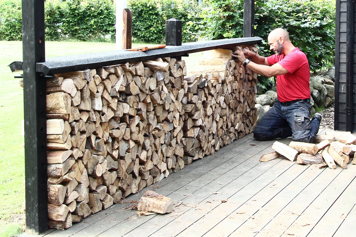 Vi sjekker om løsningen passer til vedstabelen, ved å holde snittprøvene på siden av den brede planken. Taket skal rekke litt utenfor veden, og de skrå sideflatene vil gjøre at vannet renner vekk fra planken.