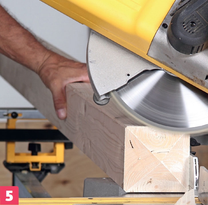 Den brede planken som skal ligge som “tak” over vedstabelen, er med sine 19,8 cm for smal til å dekke alt alene. I stedet for bare å føye til en planke i den ene siden, føyer vi til et skrått stykke på begge sider, slik at vann renner vekk.