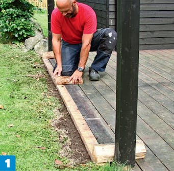 Vi lager terrassen litt bredere. For å støtte veden bedre, skrur vi en lekt på kanten av terrassen, mellom stolpene som vedstabelen skal stå mellom. Vi legger den 2-3 mm høyere enn terrassen.