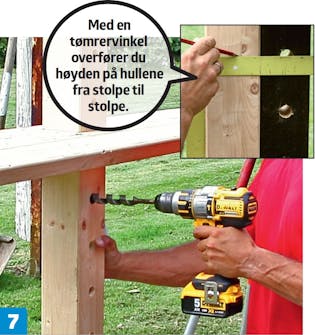 De neste stolpene får hull. Her forenkler vi oppmålingen ved å overføre målene fra første stolpe til den løse midtstolpen, og derfra videre til den siste stolpen. Midtstolpen skal bare stå oppå terrassen.