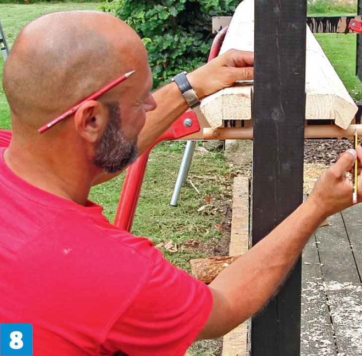 Åpningene til de to stolpene strekes opp. Takplanken legges ved siden av stolpene, og med tømrervinkelen til hjelp, streker vi opp hvor vi skal lage plass til stolpene - og hvor langt taket skal være.