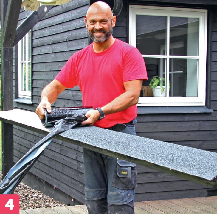 Treverket skal ha en omgang med beis eller en annen trebeskyttelse, før vi legger takbelegg på oversiden. Det kan du gjøre med taket lagt opp på et par bukker, men fordi vi gir den samme trebeskyttelsen på både tak og stolper, legger vi det på plass før vi maler.