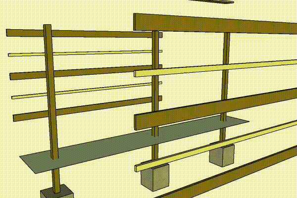 Dette gjerdet er bygget av trykkimpregnerte stolper, bord og lekter, og kledd med smale lister.