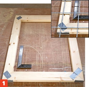 Armeringsnettet settes fast i sidene og toppen. De skal danne en åpen firkant. Slå rammen sammen, til hjørnesammen-føyningene er helt tette.