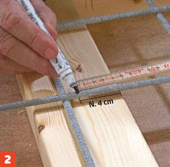 Vi legger nettet oppå rammen og streker opp trådenes plassering direkte på den. Vi setter delene midlertidig sammen, foreløpig uten skruer og lim.