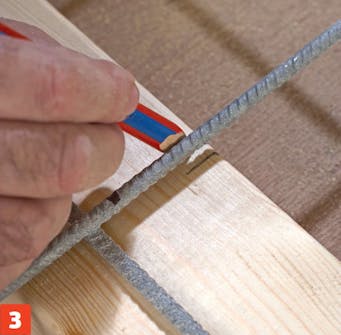 Hullene til armeringsnettet bores forskjøvet fra midten, fordi trådene i nettet sitter forskjøvet. For å bore hullene nøyaktig, lager vi en mal til å streke opp etter. Malen har to mål. Det ene er 24 mm, det andre er 21 mm. 24 mm tilsvarer midten av treet. 21 mm er 3 mm fra midten, hvilket tilsvarer tykkelsen på trådene i nettet.