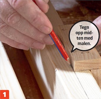 Midten tegnes opp. Lekten er 48 mm, så når vi streker opp etter 24 mm-målet, har vi midten. Gjør det på alle de fire delene av rammen. Bruk deretter det andre målet på malen, 21 mm, til å merke opp til hullene.