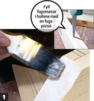 Alle gjærskjøtene limes. Bruk vannfast trelim. Det beskytter også skjøtene mot vann. Fyll hullene til armeringsnettet med fugemasse på bunndelen til rammen.