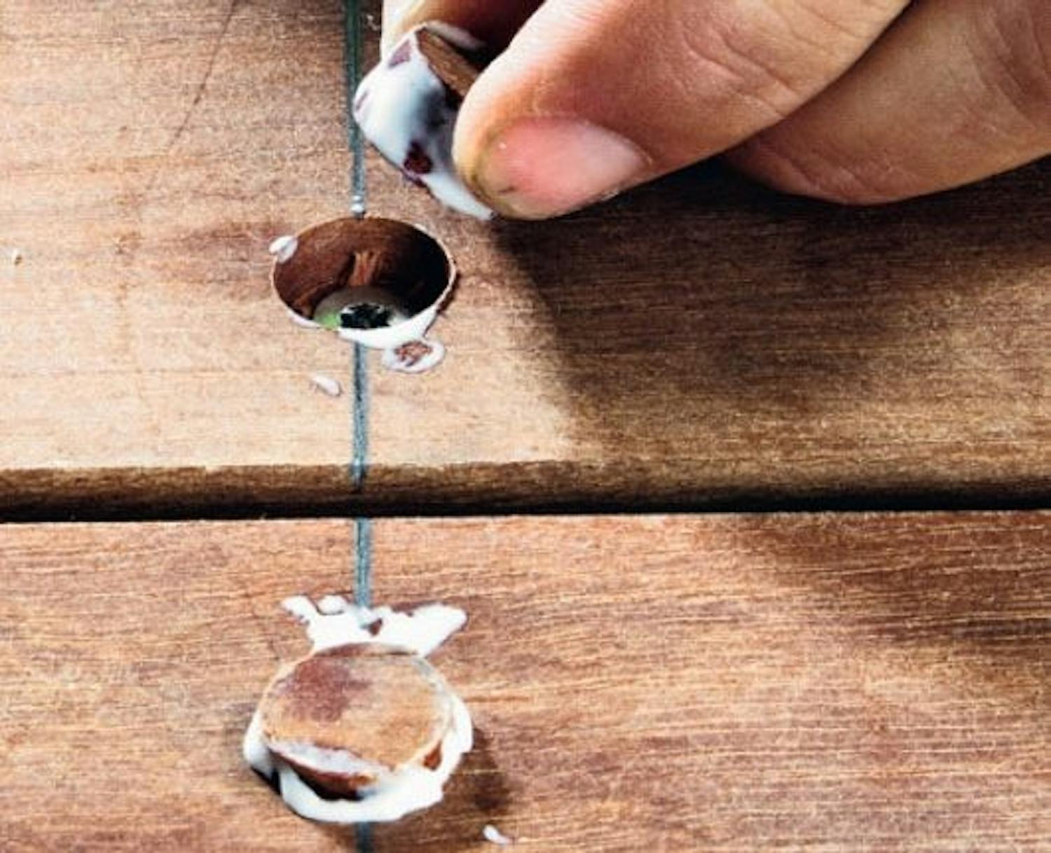 Å dekke skruene på et terrassegulv med propper er en stor jobb. Men resultatet blir pent, og det er optimalt når du vil stenge vannet ute.