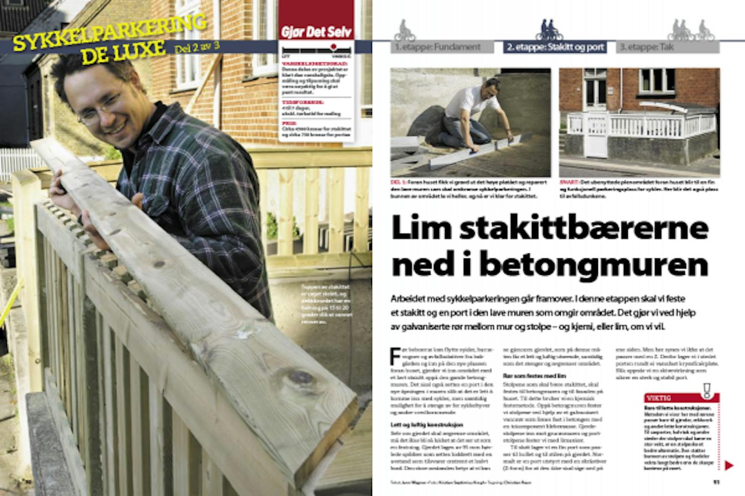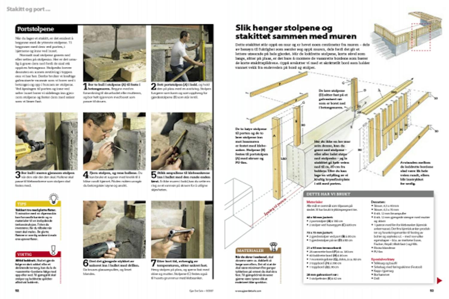 Normalt skal stolpene graves ned eller settes på stolpesko. Her er det umulig å grave dem ned fordi de skal stå oppå en betongmur. Stolpesko krever dess uten en annen avstiving i toppen enn vi har her. Derfor bruker vi kraftige galvaniserte vannrør som vi borer ned i betongen og opp i bunnen av stolpene. Ved åpningen til porten og inne ved selve huset borer vi sidelengs inn gjen-nom stolpene og fester dem med anker som vi limer fast.