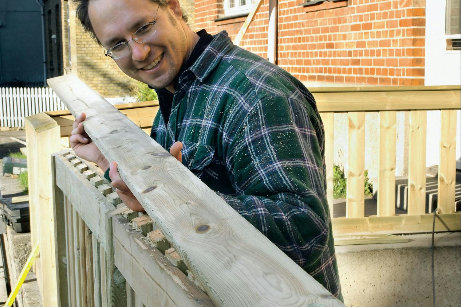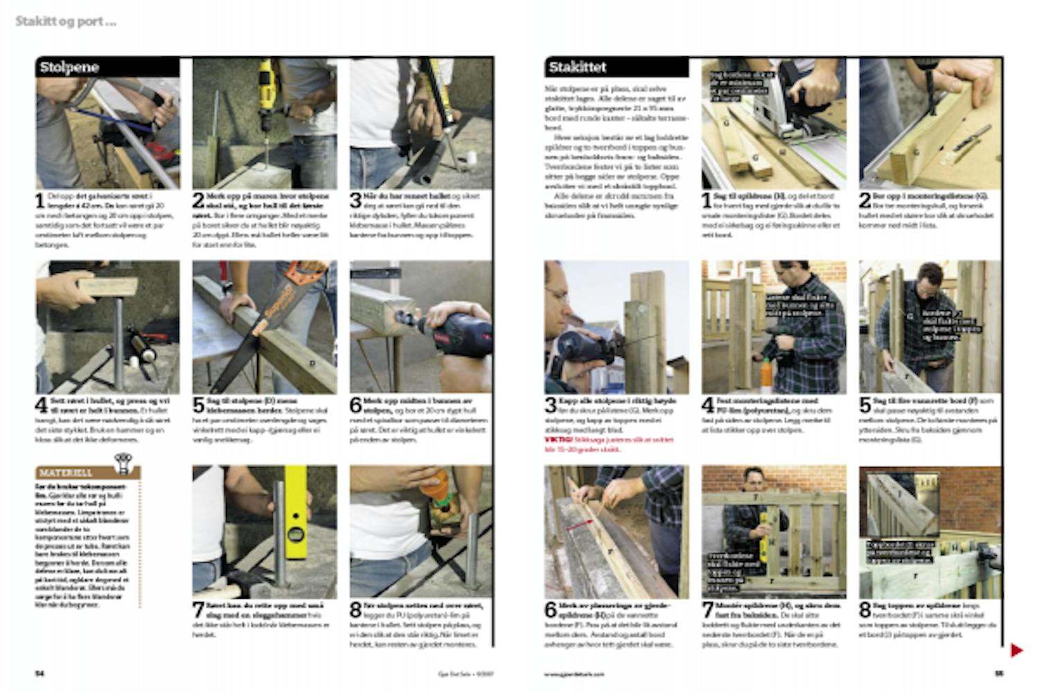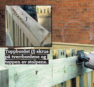 Når stolpene er på plass, skal selve stakittet lages. Alle delene er saget til av glatte, trykkimpregnerte 21 x 95 mm bord med runde kanter - såkalte terrasse-bord.