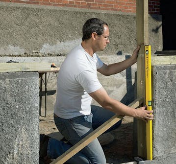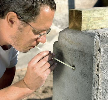 Merk opp på muren hvor stolpene skal stå, og bor hull til det første røret. Bor i flere omganger. Med et merke på boret sikrer du at hullet blir nøyaktig 20 cm dypt. Ellers må hullet heller være litt for stort enn for lite.