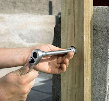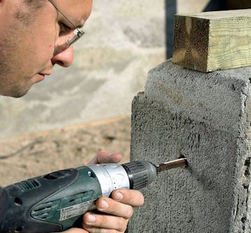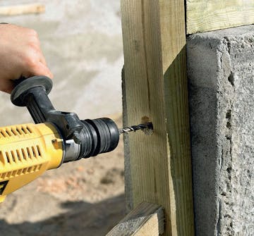 Bor hull i muren gjennom stolpen når den står der den skal. Hullene skal passe til klebeankrene som stolpen skal festes med.