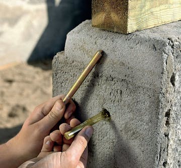 - 1 patron med lim for klebeanker (kjemisk ankermasse). Det fins kjemisk anker-produkter og forankringsmørtler til festing av bolter og søylesko o.l. - med noe ulike egenskaper - bl.a. av merkene Essve, Fischer, Heydi («Bolt fast») og Hilti.