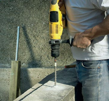 Drei det gjengede stykket av ankeret inn i hullet med drillen. Da knuses glassampullen, og limet blandes.