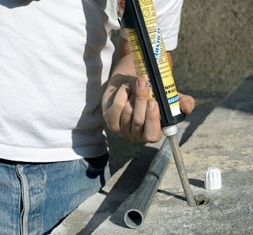 Når du har renset hullet og sikret deg at røret kan gå ned til den riktige dybden, fyller du tokomponent klebemasse i hullet. Massen påføres kantene fra bunnen og opp til toppen.