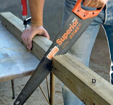 Sag til stolpene (D) mens klebemassen herder. Stolpene skal ha et par centimeter overlengde og sages vinkelrett med ei kapp-/gjærsag eller ei vanlig snekkersag.