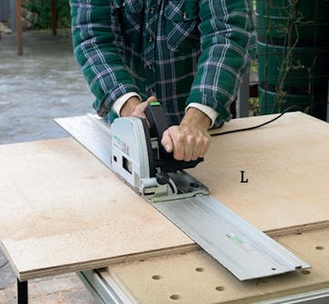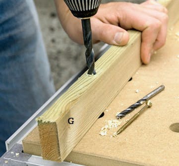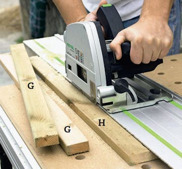 Sag til spildrene (H), og del et bord for hvert fag med gjerde slik at du får to smale monteringslister (G). Bordet deles med ei sirkelsag og ei føringsskinne eller et rett bord.