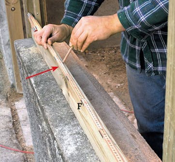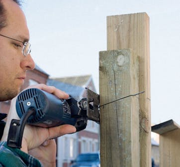 Kapp alle stolpene i riktig høyde før du skrur på listene (G). Merk opp stolpene, og kapp av toppen med ei stikksag med langt blad. VIKTIG! Stikksaga justeres slik at snittet blir 15-20 grader skrått.