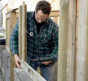 Sag til fire vannrette bord (F) som skal passe nøyaktig til avstanden mellom stolpene. De to første monteres på yttersiden. Skru fra baksiden gjennom monteringslista (G).