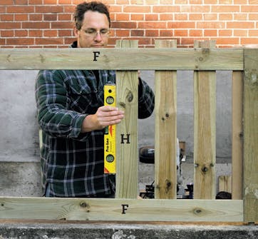 Hver seksjon består av et lag loddrette spildrer og to tverrbord i toppen og bun-nen på henholdsvis fram- og baksiden. Tverrbordene fester vi på to lister som sitter på begge sider av stolpene. Oppe avslutter vi med et skråstilt toppbord.
