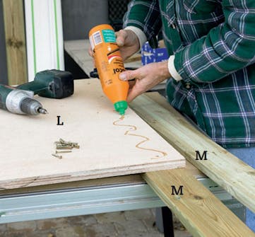De fire loddrette bordene (M) sager du slik at de er litt lengre enn porten skal være høy. Montér dem på begge sider av kantene på plata med PU-lim og skruer slik at de flukter med sidene og bunnen på plata.