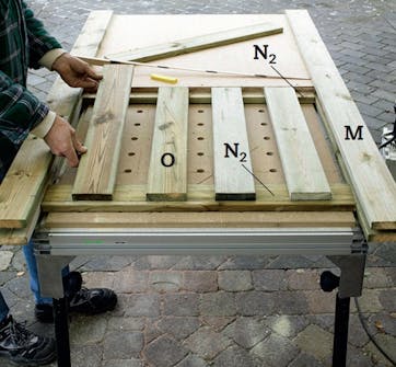 Nå skal du skru de loddrette bordene (O) fast til det midterste tverrbordet (N2). I toppen skrur du dem fast til det øverste tverrbordet (N1) slik at de ligger halvt oppe på tverrbordet.