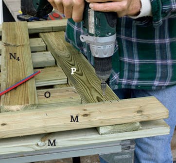 På toppen plasseres et avstands-bord (P). Skru og lim det fast til både tverrbordet (N1) og de loddrette bordene (M). Plassér (N4) mellom de loddrette bordene (M) og ned over på bordene (O).