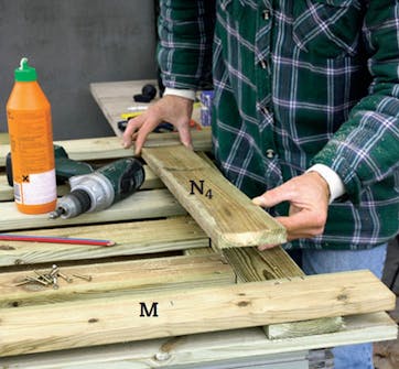 Sag ut de seks tverrbordene (N) slik at de passer mellom de loddrette bordene (M), og sag bordene (O) slik at de er lik avstanden mellom tverrbordene (F) i stakittet pluss 90 mm.