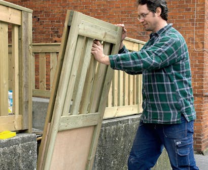 Sag til ei plate (L) av 21 mm vannfast kryssfinér. Plata skal være 10-15 mm smalere enn hullet, og høyden måler du fra et par cm over bakken til midt på de nederste tverrbordene på stakittet.