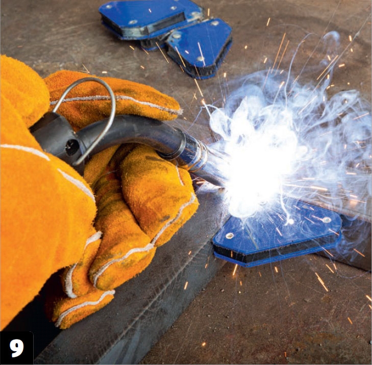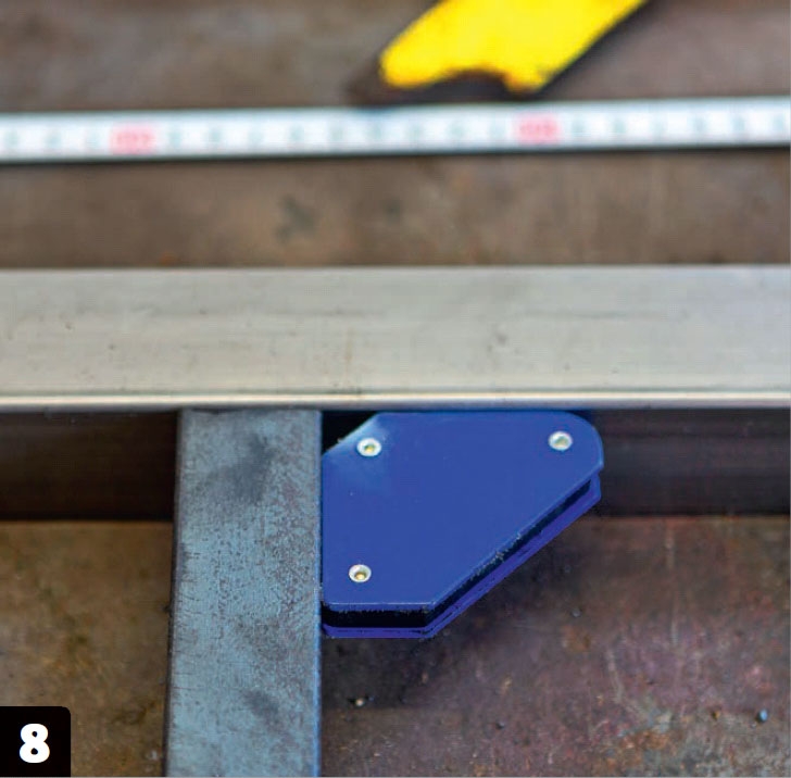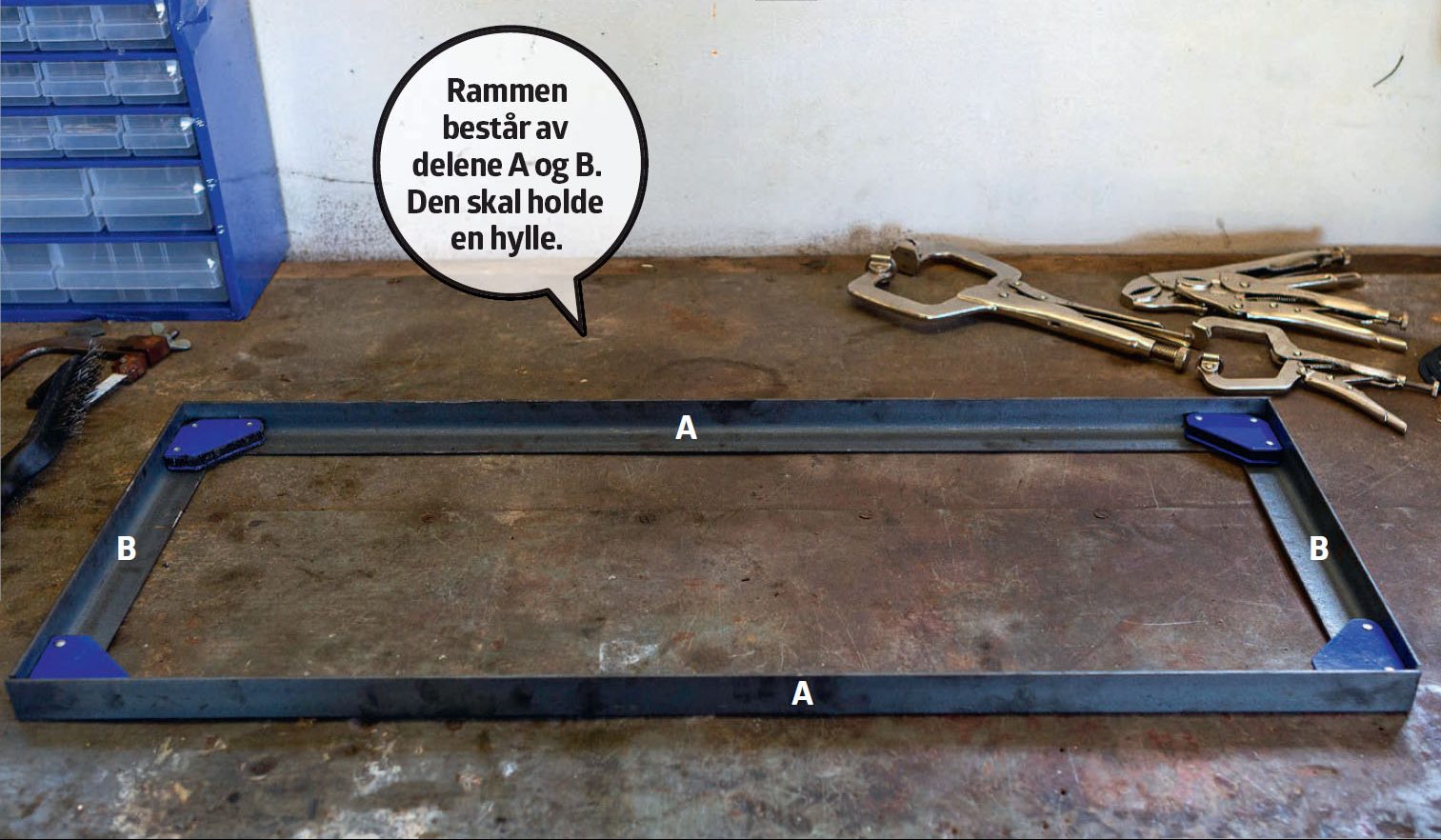 Gi hvert hjørne en sveisekladd. Delene skal bare akkurat henge sammen. Selve sveisesømmen lager du først senere. Etterpå kan du fjerne vinkelmagnetene.
