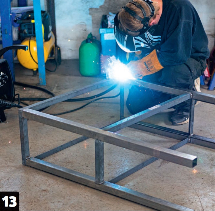 Sveis delene sammen med et enkelt punkt i hver sammenføyning. Gjør det i begge sider. Gjenta prosedyren på det andre beinsettet. Sjekk at delene er vinkelrett på hverandre. Ellers kan de vris.