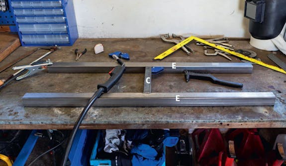 Nå skal beinsettene sveises. De to lange beina (E) og en avstiver (C) legges opp som vist. Stiveren sitter på midten av røret.
