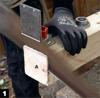 Stolpen kappes til slik at du får fire bein (A), der hvert bein er 60 cm langt. Det er viktig at snittene er helt vinkelrette for at benken ikke skal vippe. Her sages det etter en mal for å sikre et rett snitt.