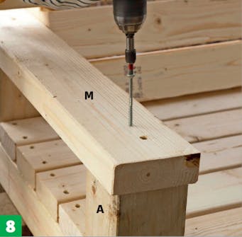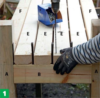 Skru fast de ytterste plankene til setet (F) - de som sitter mellom beina (A) - til de lange vangene. Her får de tre lange skruer hver, som settes i midten og i hver side.