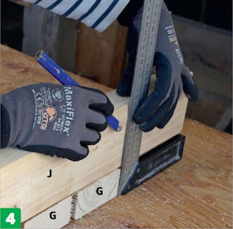 Plankene til rygglenet (G og H) legges opp med avstandsstykker mellom, så avstanden blir jevn. Mål hvor høyt rygglenet er. Målet er høyden på de to ytterste rammedelene (J) bak rygglenet. Kapp til delene.