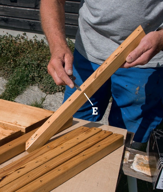 Nå kan du montere benken. Bor gjennom hullene i skjøtestykkene (E) og inn i beina med et 3 mm bor. Skru 5 x 50 mm skruer gjennom stykkene og inn i beina (F).