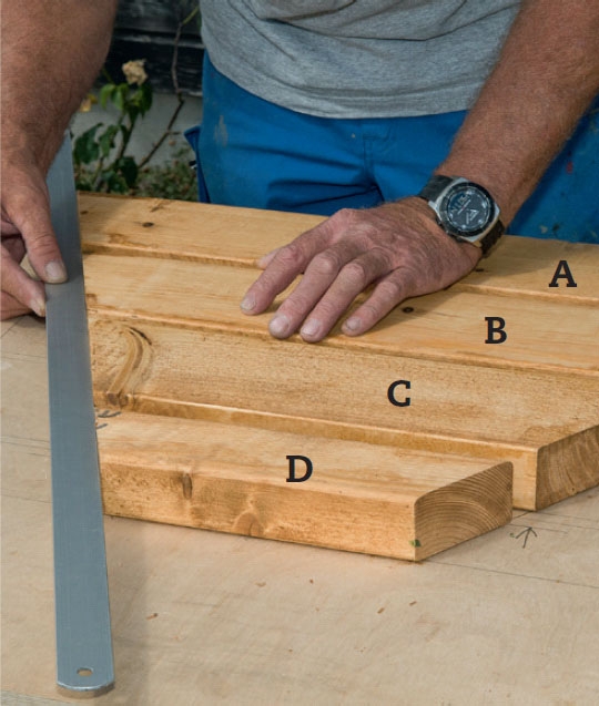 Del en bjelke i i to lister (D), som hver blir 60 mm bred, minus et halvt sagspor. Har sagen et parallellanlegg, er det fint å bruke. Kantene rundes med høvel eller slipepapir.