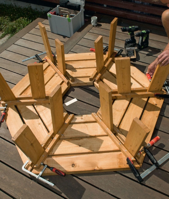 Benken består av seks like seksjoner. Det betyr at du må serieprodusere mange elementer, og her er kapp-/ gjærsagen og et godt sage-bord til god hjelp: Juster sagen til 30 grader, og lag et lengdestopp på sagbordet. Da kan du kappe seks elementer om gangen, før du flytter lengdestoppet (som også bare kan være en tvinge bordet kan støtes inn mot).