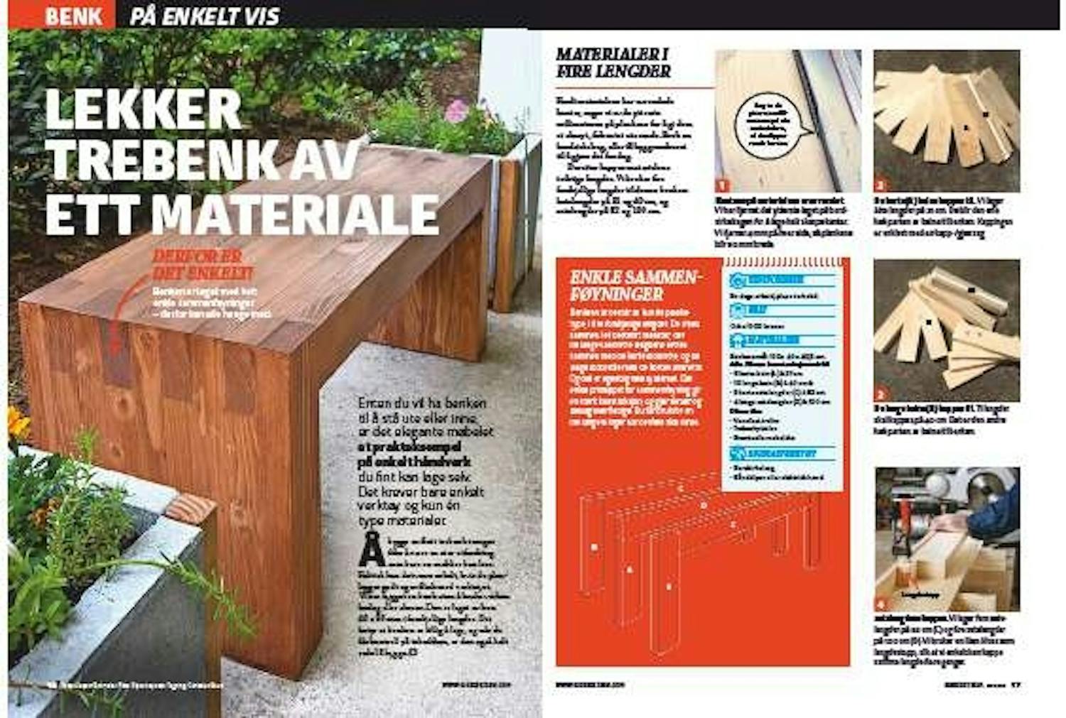 Deretter kappes materialene i riktige lengder. Vi bruker fire forskjellige lengder til denne benken: beinlengder på 31 og 40 cm, og setelengder på 82 og 100 cm.