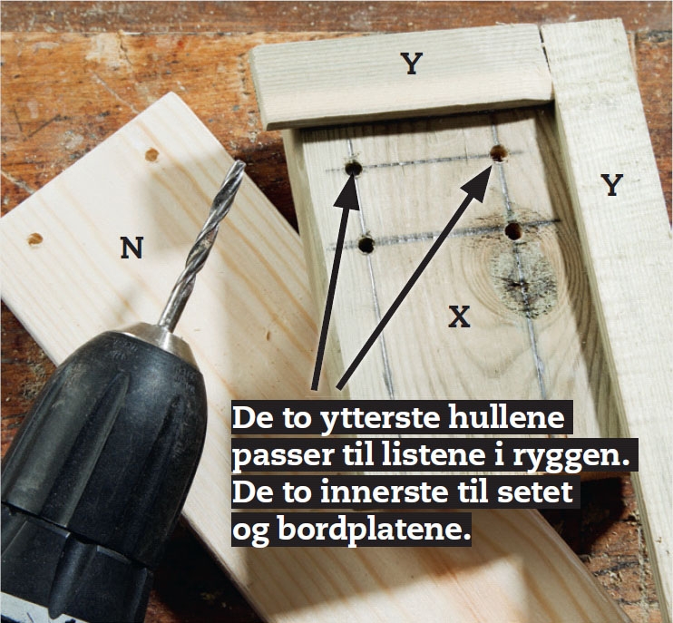 Vi forborer til skruene - de vi har oversikt over før vi setter sammen delene. Særlig på listene (N) til seter, rygger og bord er det penest at de sitter på linje. Vi lager derfor en boremal (X) med kanter (Y). Den legges over listen (N), før vi borer.