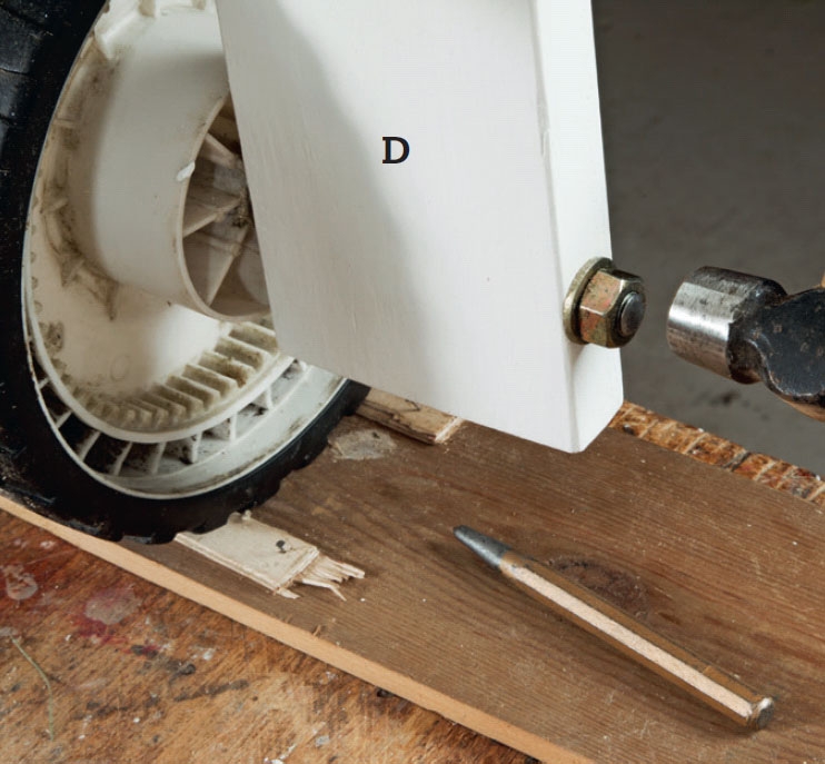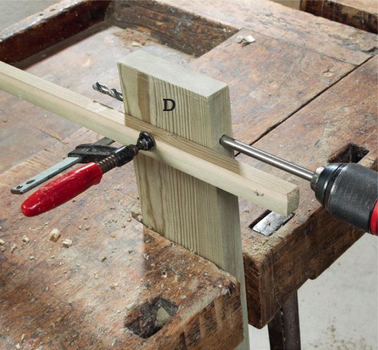 I de to hjulbeina (D) borer vi 12 mm hull til hjulakslingen. For å ha noe å sikte etter, spenner vi en list på siden.