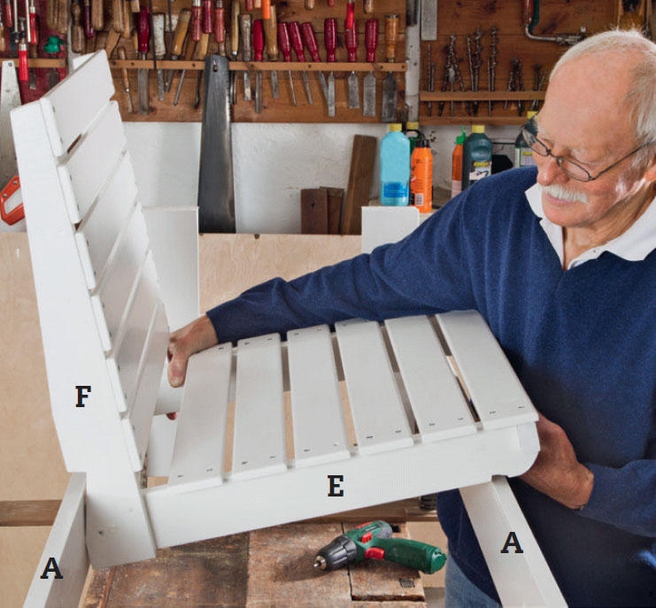 Sargene (E) og ryggstykkene (F) settes sammen med to 40 mm skruer over tegningen av benken sett fra siden. Mellom langsidene (A) er det 50 cm, og sete og rygg er i rett vinkel innbyrdes. Du avgjør selv hvor skrått benkene skal stå.