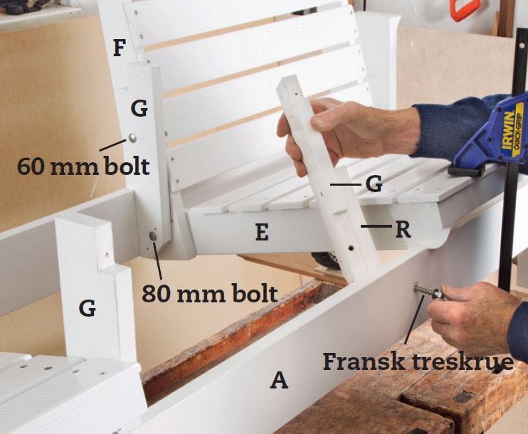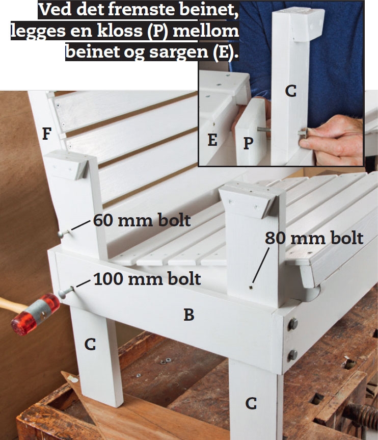 Bordbeina (G) settes fast. Øverst på baksiden får de en 60 mm bolt gjennom ryggen (F), nederst en 80 mm bolt gjennom sarg (E) og rygg (F). Foran setter vi en fransk treskrue gjennom rammen (A) og en 80 mm bolt gjennom en kloss (R) og sargen (E).