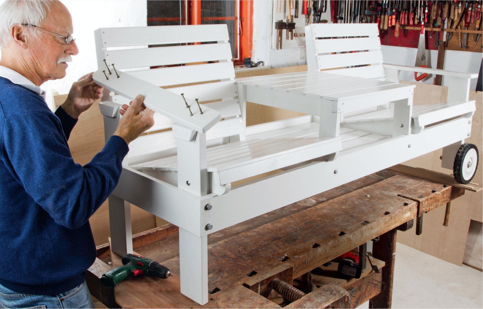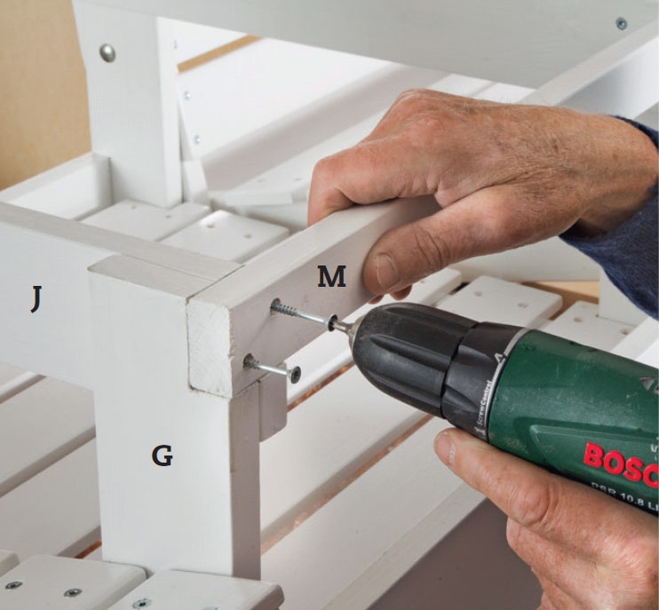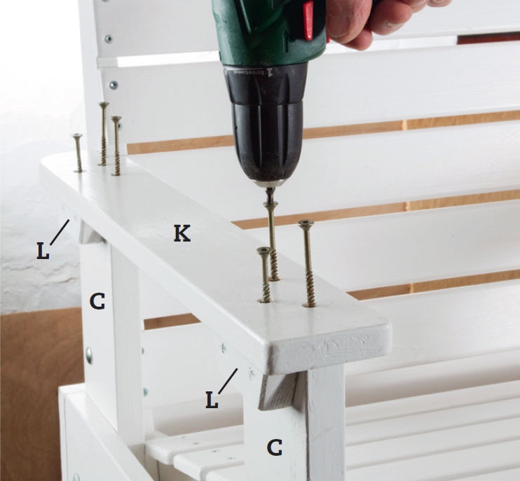 Armlenet (K) skrus solid fast, fordi det i den ene enden er opplagt å løfte benken i armlenet. Øverst på alle bein (C og D) har vi tilføyd en kloss (L), som støtter armlenet. Vi setter to 5 x 60 mm skruer ned i beinet og en 4 x 40 mm skrue ned i klossen.