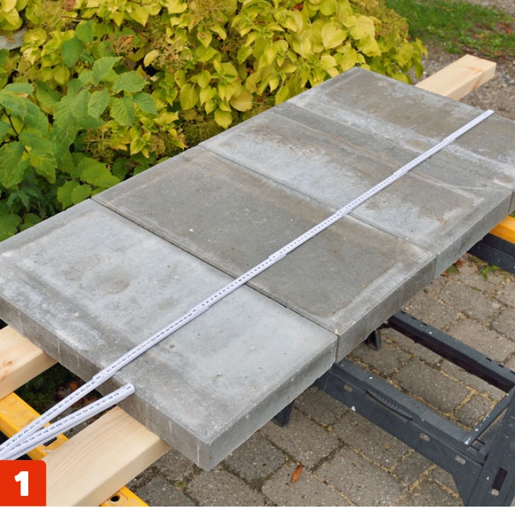Fordi bordet skal bygges etter betonghellene, legger vi dem etter hverandre, sjekker det nøyaktige målet og justerer eventuelt målene på bordet.