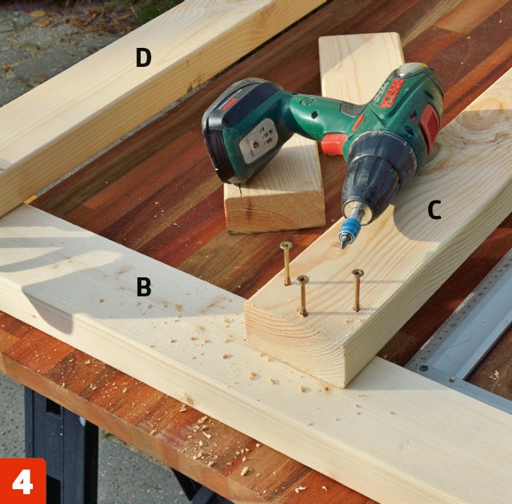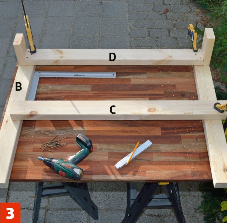 Skru fast understøttingen (C) og tverrstiveren (D) til beina (B) med 5 x 80 mm skruer - tre i hver skjøt.